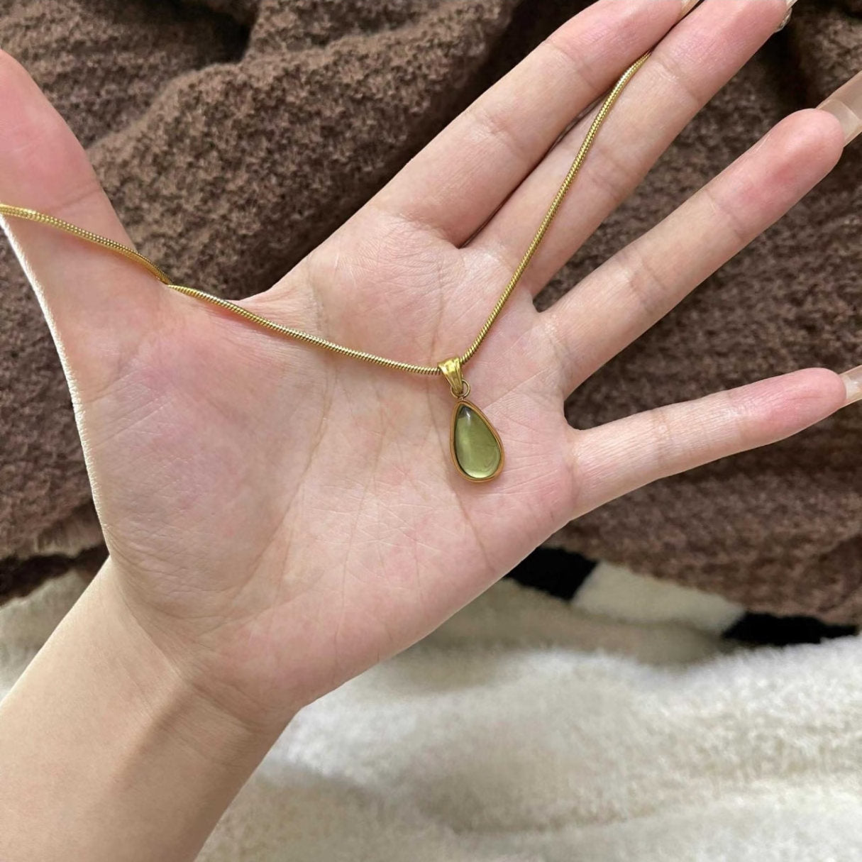 Product information: Color: L057 a green water drop, L057 a blue water drop Applicable population: Female Pendant material: mixed gem inlaid Chain style: snake bones chain Material: titanium steel Shape: drop shape